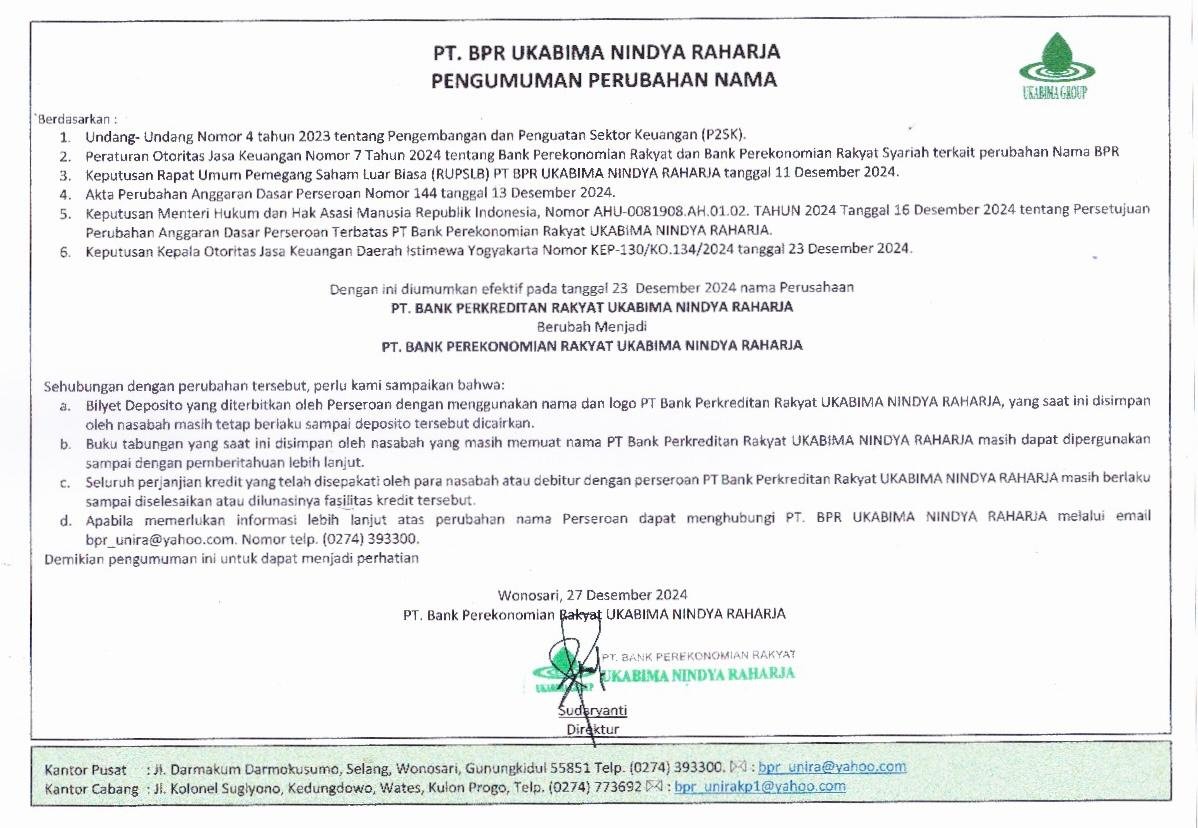 PT. Bank Perekonomian Rakyat Ukabima Nindya Raharja merupakan Bank Perkreditan Rakyat yang melakukan kegiatan perbankan berupa tabungan, deposito dan penyaluran kredit kepada masyarakat umum .Bank Perkreditan Rakyat merupakan lembaga perbankan resmi yang diatur berdasarkan UU No.7 tahun 1992 dan sebagaimana telah diubah dengan UU No.10 tahun 1998.